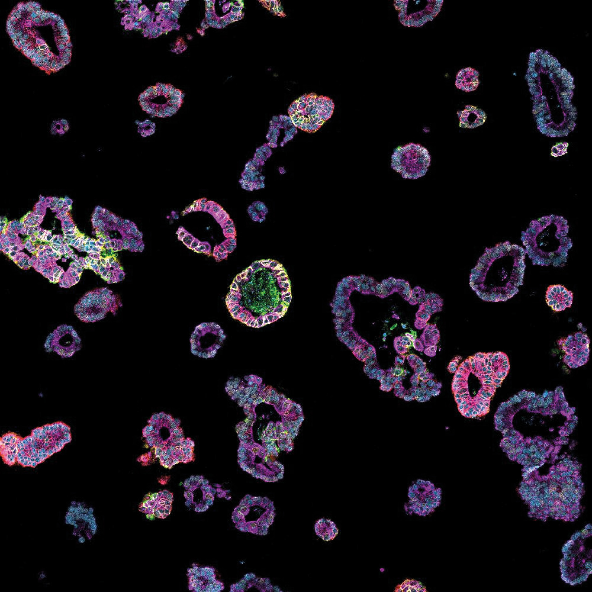´IHB I.S. (InSight): A constellation of organoids derived from colorectal cancer tissue. These organoids were generated from patient tumour tissue with the goal of establishing a biobank of models that accurately capture the heterogeneity of the patient population affected by colorectal cancer (CRC). The image demonstrates that the organoids maintain the well-known heterogeneity of colorectal cancer tissues, reflecting the diverse nature of the disease. CRC is one of the leading causes of cancer-related deaths worldwide, remaining a significant global health challenge. This biobank diversity is essential to facilitate the development of more effective therapeutic strategies. These patient-derived organoids hold significant promise for disease modeling, helping researchers to identify predictive biomarkers for treatment response, and ultimately, potentially improving survival rates in cancer patients. This organoid image was obtained with imaging mass cytometry (IMC), a methodology that enables the simultaneous detection of up to 40 antigens using metal-tagged antibodies. The organoids were generated as part of a collaboration with the Precision Medicine Laboratory at the University Hospital of Basel, and were expanded and imaged by Mairene Coto Llerena and the Roche Cell and Organoid Biorepository at IHB.