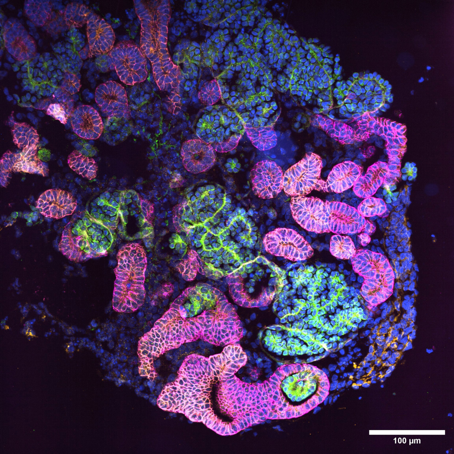 Kidney organoids represent a powerful and versatile in vitro platform that is significantly accelerating research into fundamental kidney development, disease mechanisms, and drug discovery. This image shows the immunofluorescence staining of the first kidney organoid cultured at IHB. This organoid is derived from iPSCs, induced pluripotent stem cells, after 21 days of differentiation and is expressing key markers characteristic of native kidney cell types: EpCAM-positive epithelial cells (magenta), Nephrin-expressing podocytes (green), and CDH1-expressing distal tubules (orange), and cell nuclei (blue). Thus the staining shows that the kidney organoid’s cell composition mimics a key subset of the cell types seen in actual kidneys. The pharmaceutical industry can leverage the physiological relevance of these organoids for high-throughput screening of novel drug candidates, and evaluating drug efficacy and toxicity in a human-specific context. This image was generated by Saba Rezakhani and Irineja Cubela.