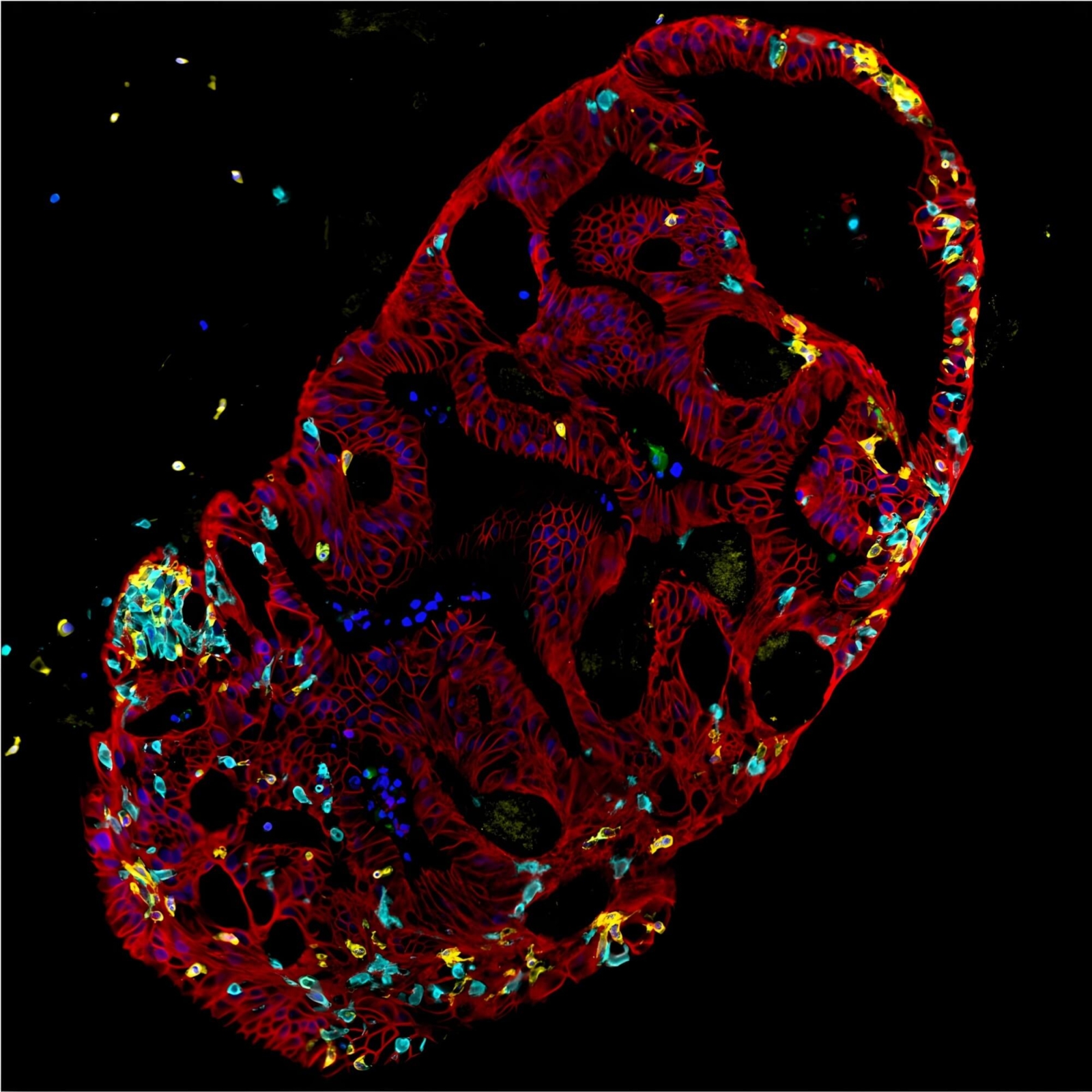 Immune-epithelial cell interactions under the microscope: multiplex-immunofluorescent image of tissue-resident memory T cells (CD4+, yellow; CD8+ ,cyan). T cells integrating and surveilling the epithelium of a donor-matched intestinal organoid (E-Cadherin+, red; Nuclei, blue). Credit: Marius Harter.